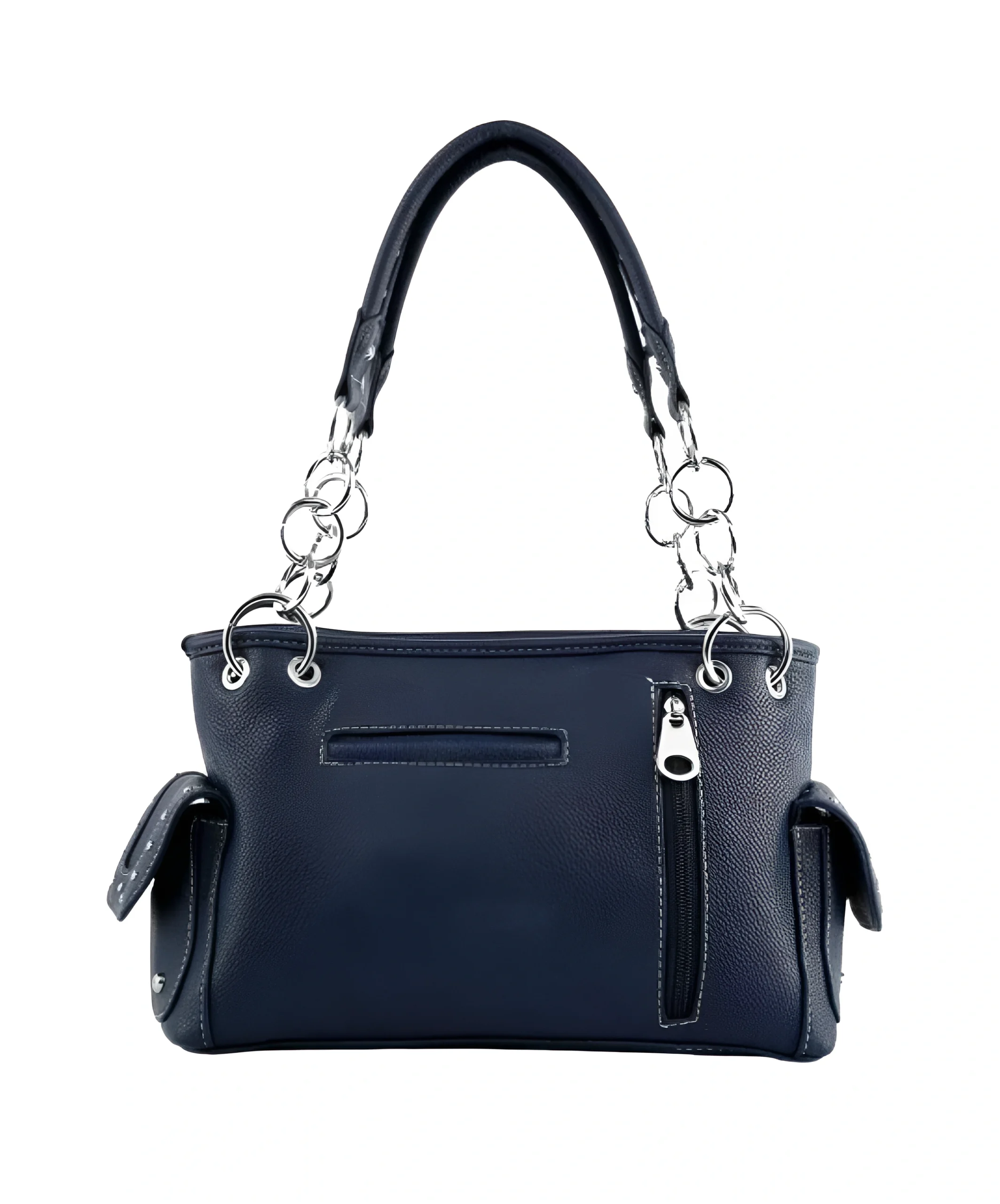 Il frontale di questa borsa western americana è un capolavoro di stile. Le strisce rosse hanno file di strass scintillanti. Il riquadro blu ospita stelle argentate in rilievo. L’effetto 3D è dinamico e lussuoso. Il perimetro è rifinito con borchie circolari e strass incastonati. I doppi manici sono collegati da catene ad anelli argentati. Aggiungono luce e modernità al design.